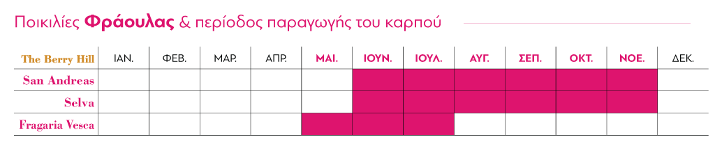 Η φράουλα είναι ίσως το πιο γνωστό φρούτο του δάσους που γνωρίζουμε. Θαμνώδης καλλιέργεια με μεγάλους κόκκινους και εύγεστους καρπούς.